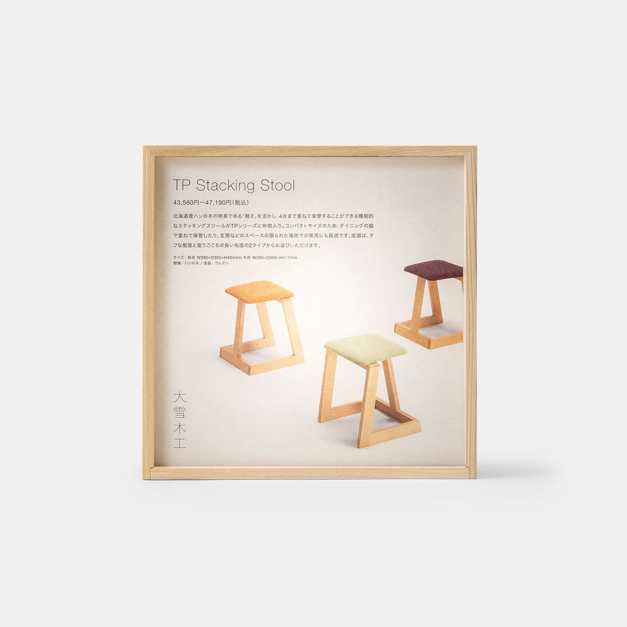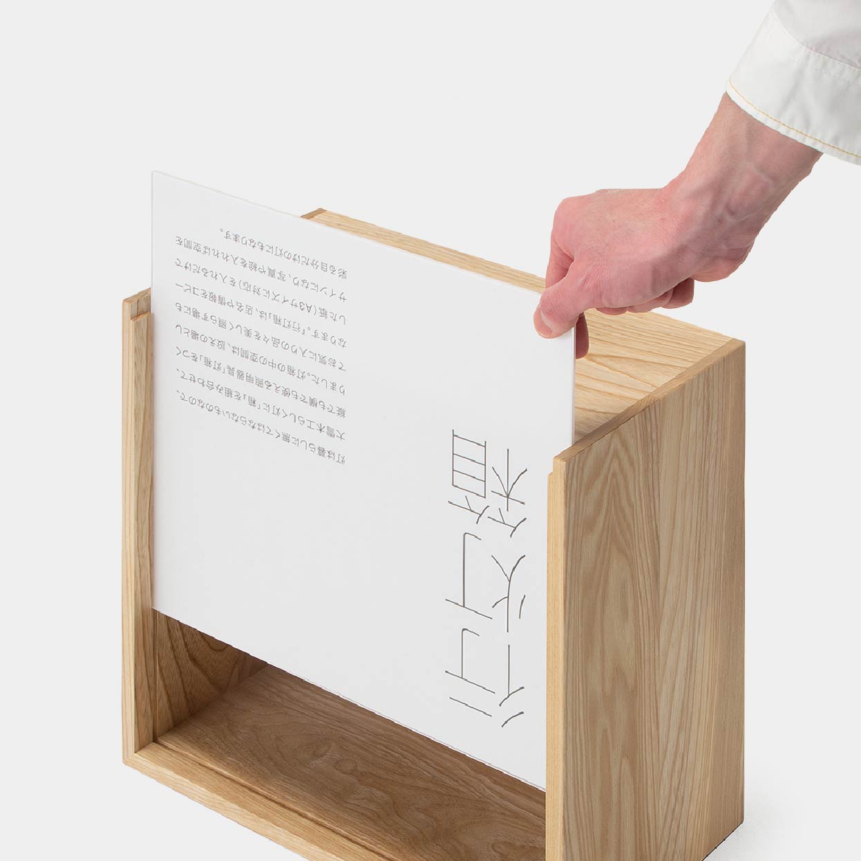 店名や情報をコピーした紙を入れるだけでサインになる行灯箱。A3サイズの用紙に印刷し、正方形となるよう長辺をカットするだけで、簡単にサインを作ることができます。一方、お気に入りの写真や絵を入れれば、空間を彩る自分だけの灯にも。シンプルな機能性と、天然木と暖色照明で空間に暖かみを添える行灯箱は、小空間でも住空間でも活躍します。