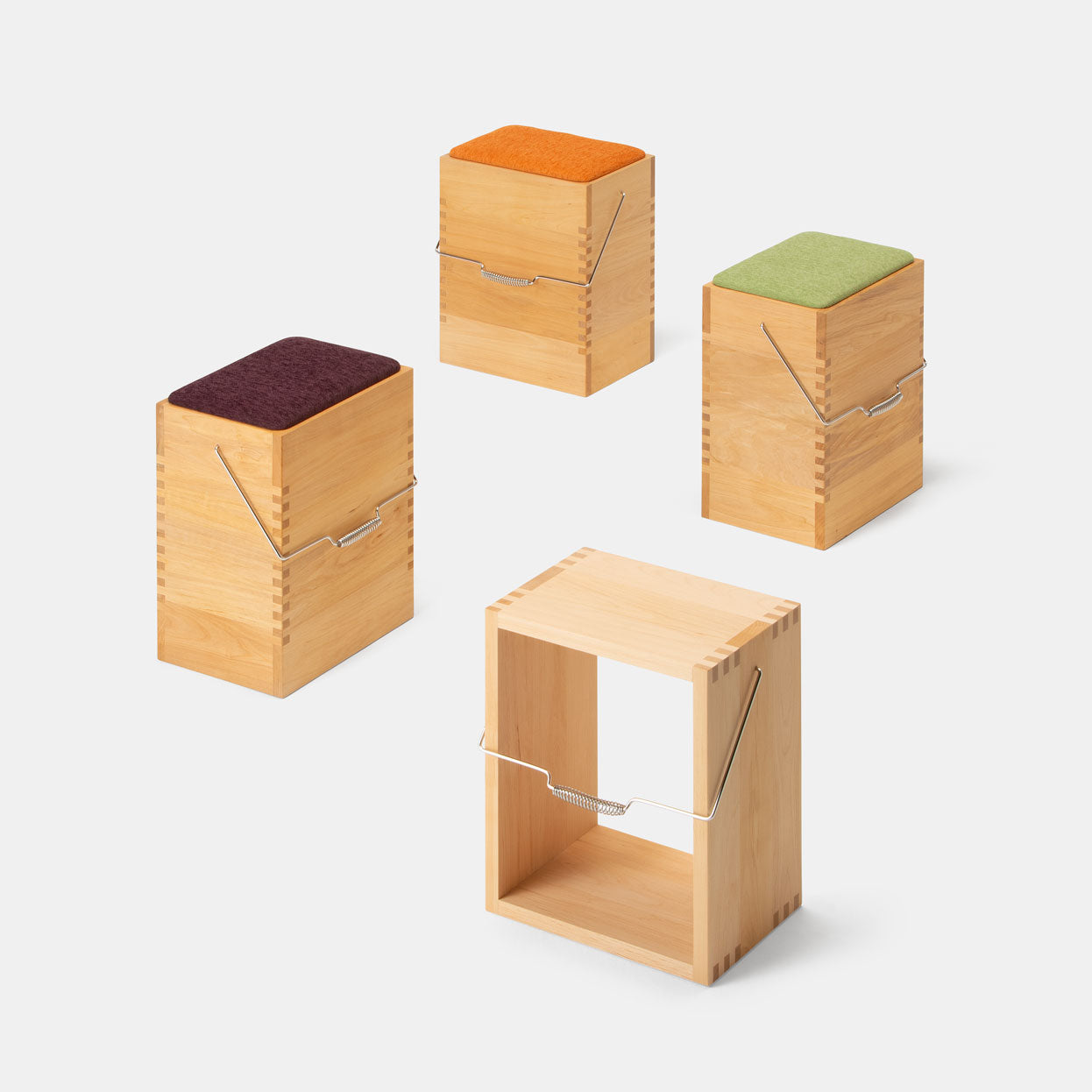 ステンレス加工では世界有数の産地である、新潟の燕三条地区で製造された「バケツの取っ手」と、大雪木工が得意とする「箱」を組み合わせることで生まれたバケツ箱。A4サイズ程度の物を運ぶことができる箱であり、座る道具でもあるアイテムです。